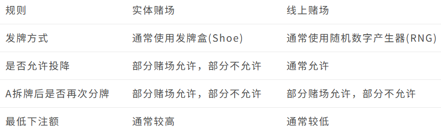 在实体赌场中,玩家需要注意赌场的氛围和潜在的干扰因素。保持冷静、专注,避免受到其他玩家或赌场工作人员的影响。此外,也要注意赌场的规则和礼仪,例如在发牌过程中不要触碰牌,不要在牌桌上使用手机等。遵守赌场的规则,可以避免不必要的麻烦,并保持良好的游戏体验。下表列出了一些常见的规则差异:
